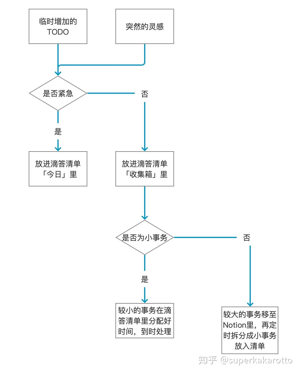 下面讲一下我如何使用这两款工具。首先是它们的定位,「滴答清单」好比我随身携带的手枪,而「Notion」则是一艘无所不能的航空母舰。在工作流里,滴答清单只负责最小单位的事项,不负责项目级和目标的管理,这部分我交给了「Notion」。所以我的工作流画出来大概是这样的: