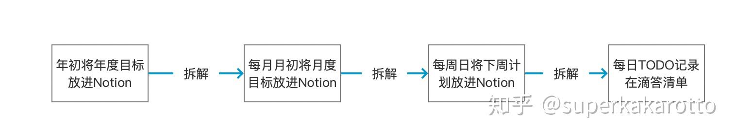 我会在月初将年度目标拆分到这个月里,放进我的月度目标里,在每周日把下周的目标放进「Notion」里的「每周安排」里,这样这一周我就有清晰的目标和方向。每天再根据「每周的目标」「临时事务」「延期未完成事务」安排我的今天 todo,记录在「滴答清单」中。